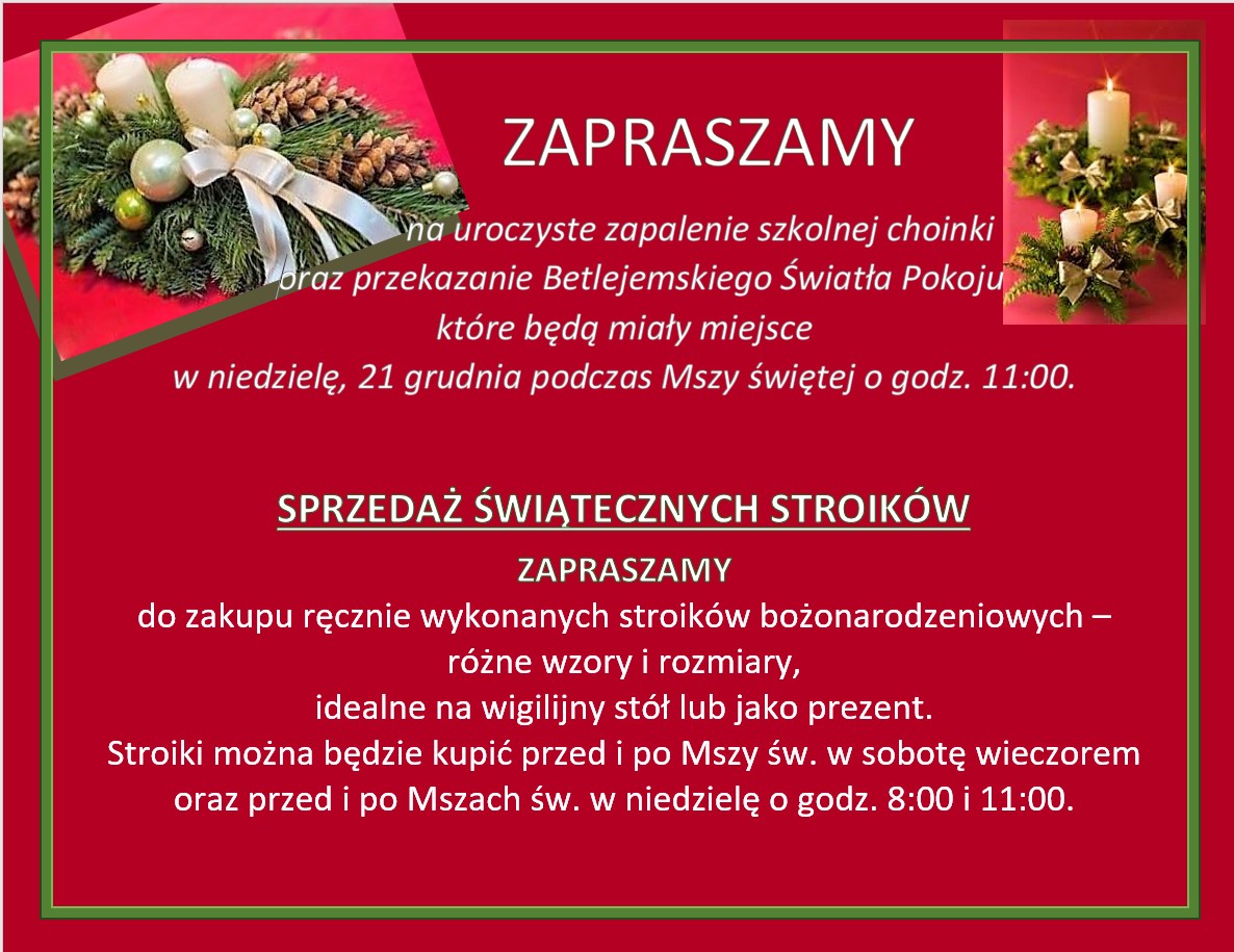 Na 20- go grudnia każde dziecko przynosi do szkoły stroik świąteczny. Stroiki będą sprzedawane w kościele na cele naszej szkoły.